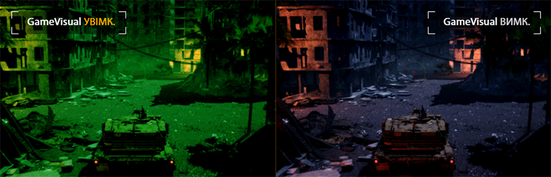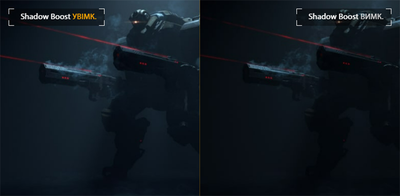 Технологія ASUS Shadow Boost покращує чіткість темних фрагментів ігрових сцен без впливу на більш яскраві ділянки. Це дозволить швидше помітити ворога, який зачаївся в тіні.