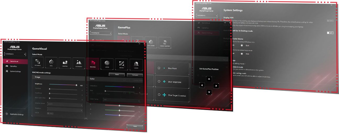 Ексклюзивна технологія ASUS GameVisual дозволяє швидко налаштовувати монітор відповідно до поточних завдань і умов, щоб отримати максимально якісне зображення. Усього доступно вісім режимів налаштування. Між ними можна легко перемикатися натисканням на спеціально виділену для цього кнопку або за допомогою екранного меню.