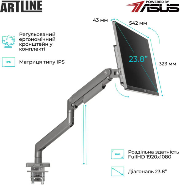| Комплектація (можливі зміни в різних поставках) | Адаптер живлення, Документація, Кабель живлення, Кронштейн, Моноблок |