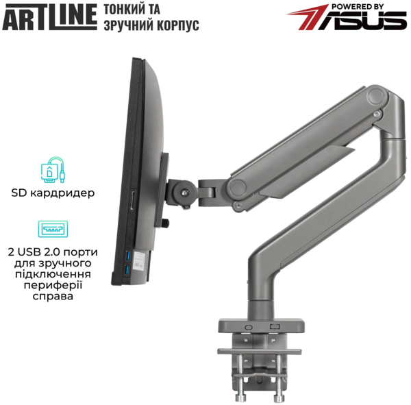 Моноблок оснащений усіма необхідними портами та роз'ємами, зокрема USB 3.0 та SD card reader, що забезпечує зручне підключення зовнішніх пристроїв і швидку передачу даних.
