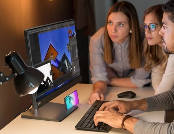 Яскравий 23.8-дюймовий FHD-дисплей із опційним сенсорним інтерфейсом має вражаюче співвідношення сторін 16:9 і широкі кути огляду. Велике співвідношення площі екрану до корпусу у 88.6% і майже безрамкові панелі створюють елегантне, але професійне враження, завдяки чому ThinkCentre Neo 50a виділятиметься в будь-якому офісі. А завдяки динамікам Harman він також відтворює чудовий звук.