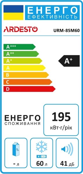 Загальний об’єм ARDESTO URM-85M60 – 60 л. Час автономного збереження холоду в морозильній камері – 9 год. Також підтримується функція швидкої заморозки із продуктивністю 6,5 кг на добу. Для зберігання продуктів передбачено три відділення (один ящик для фруктів та овочів).