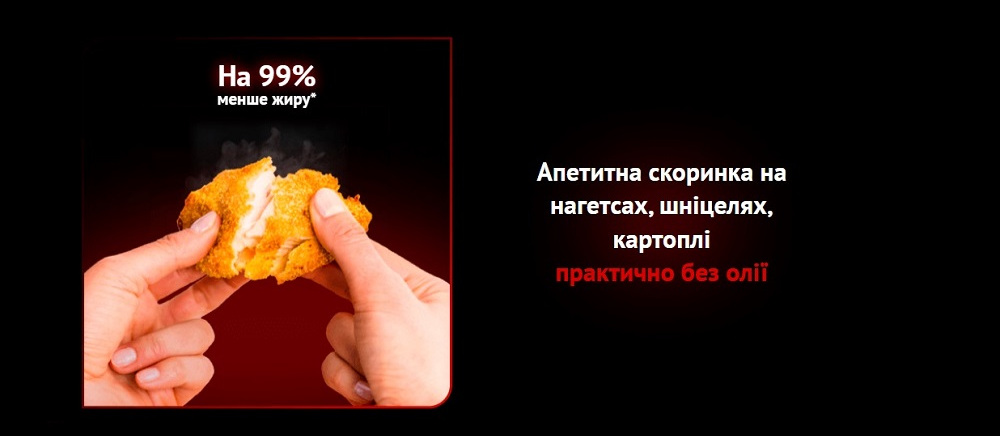 Добрий день, Алло. Завдяки інфрачервоному нагріванню і конструкції Easy Fry Infrared, для більшості страв потрібно мінімум або зовсім немає потреби в додаванні олії.