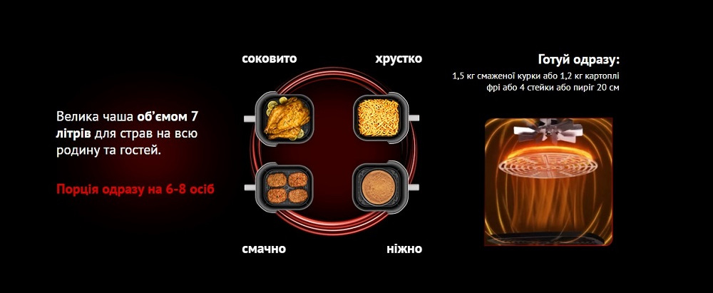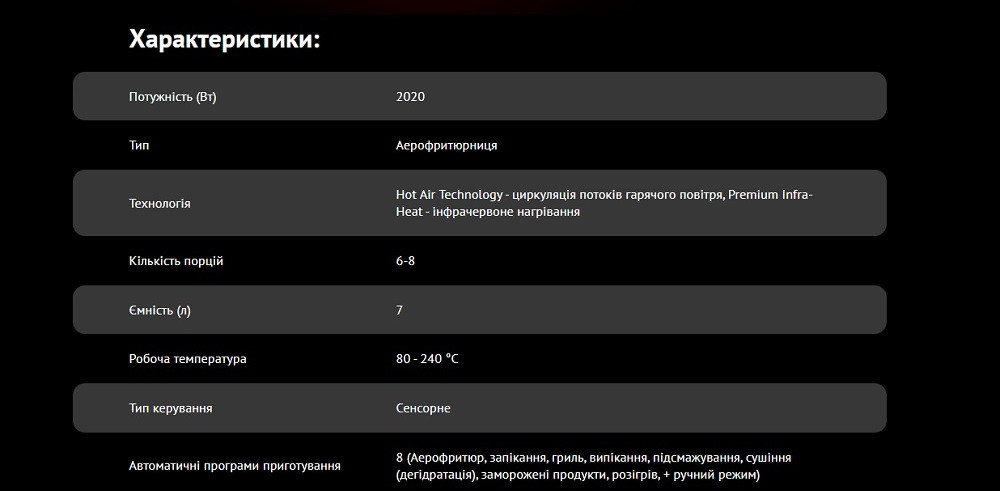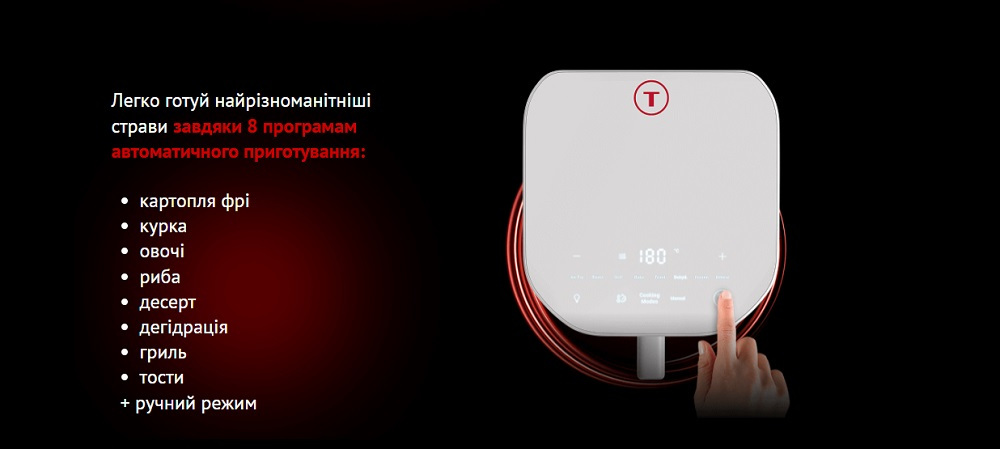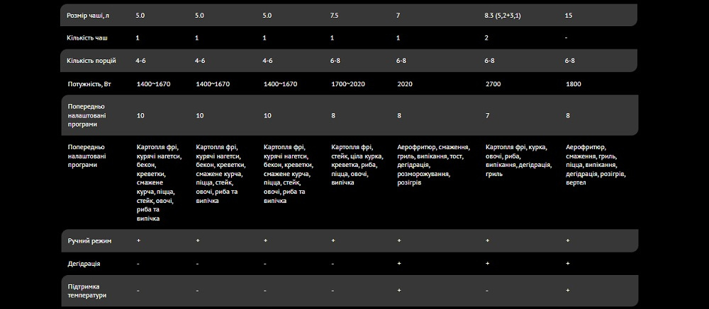 | Список програм | Випічка, Гриль, Дегідрація, Смаження, Запікання, Розморожування, Розігрів, Фритюр |