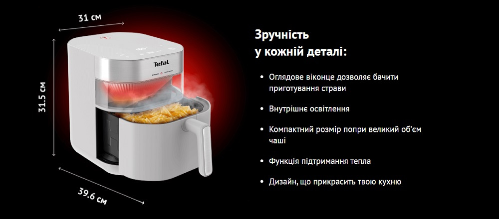 Відкрийте для себе Easy Fry Infrared - першу мультипіч від Tefal з інфрачервоною технологією. Готуйте хрусткі та смачні страви з мінімальною кількістю олії або зовсім без неї та отримуйте рівномірне приготування зверху донизу. Завдяки місткому кошику для готування - мультипіч легко вміщує великі інгредієнти, що робить її ідеальною для родини. Зручні функції забезпечують простоту використання: оглядове вікно для контролю приготування, цифрова панель керування та кошик, що можна мити в посудомийній машині, для легкого очищення.
