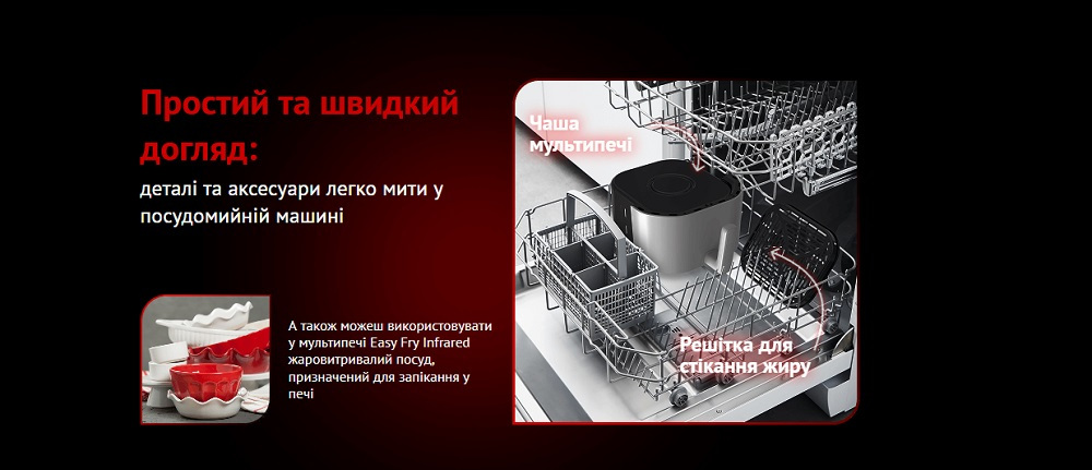 Панель управління зрозуміла, нічого зайвого, усе інтуїтивно. Дуже подобається, що під час готування не треба нічого перевертати, з усіх боків страва пропікається однаково. Мити чашу легко, закинула в посудомийку й готово. Об’єм великий, на 3-4 порції точно вистачає. Працює тихо, не напрягає взагалі. Поки що лише плюси.
