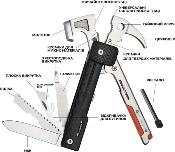 | Інструмент | Гайковий ключ, Цвяходер, Консервний ніж, Хрестова викрутка, Кусачки для м`яких матеріалів, Кусачки для твердих матеріалів, Молоток, Напилок, Ніж, Кресало, Відкривачка для пляшок, Пила для дерева, Плоска викрутка, Плоскогубці, Силіконові плоскогубці |