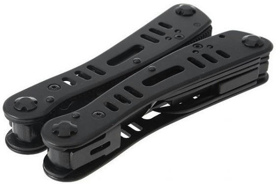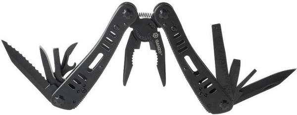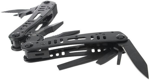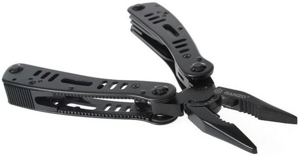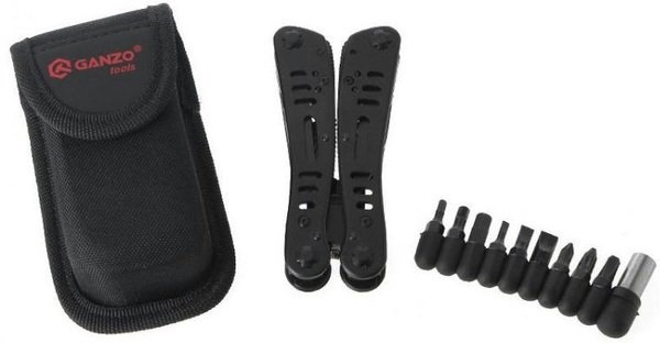 Мультитул Ganzo G103 цілком виправдовує звання»кишенькової майстерні". Цей інструмент допоможе вам усунути несправності велосипеда, туристичного спорядження, екіпірування мисливця або рибалки. Та й в домашньому побуті він стане в нагоді не один раз. Одне з основних переваг такого мультитула-наявність повноцінних плоскогубців з потужними підпружиненими губками, вбудованими кусачками для дроту і ребристим захопленням для предметів круглої форми. Крім того, в порожніх зсередини ручки мультитула розміщуються відкривачка для пляшок, дві плоскі та хрестоподібна Викрутки, шило (його ж можна використовувати в якості маленького ножа), лінійка, на зворотному боці якої — напилок, два клинки (гладкий і з серрейторним заточуванням). Також є тримач для біт з квадратним перетином. Самі ж біти додаються в окремому органайзері: 8 змінних насадок і перехідник. Розмір в розкритому стані 193 мм. Хоча мультитул і зроблений з нержавіючої сталі, на інструменти нанесено стійке чорне покриття, яке грає роль додаткового бар'єра для корозії. До того ж завдяки цьому покриттю, мультитул — матовий і виглядає дуже стильно. Для зберігання мультитула разом з бітами, передбачений тканинний чохол.