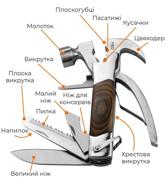 Multitool 13 в 1 NEO — це багатофункціональний інструмент, що має 13 застосувань: плоскогубці, гайкові ключі, кусачки, щипці для витягування цвяхів, молоток, 2 плоскі викрутки, викрутка PH, малий ніж, великий ніж, відкривачка для банок, пилка, напилок. У комплекті є нейлонова сумка з кріпленням для ременя. Виготовлений з нержавіючої сталі.