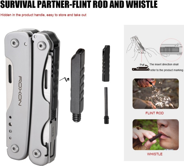Модель Roxon S803E — це другий повноформатний мультитул в асортименті компанії (після Roxon Spark CM1349), в конструкції якого є кресало та свисток. Інструмент підходить для повсякденного носіння та експлуатації, оскільки в ньому витримано баланс між функціональністю та компактними розмірами у складеному положенні.