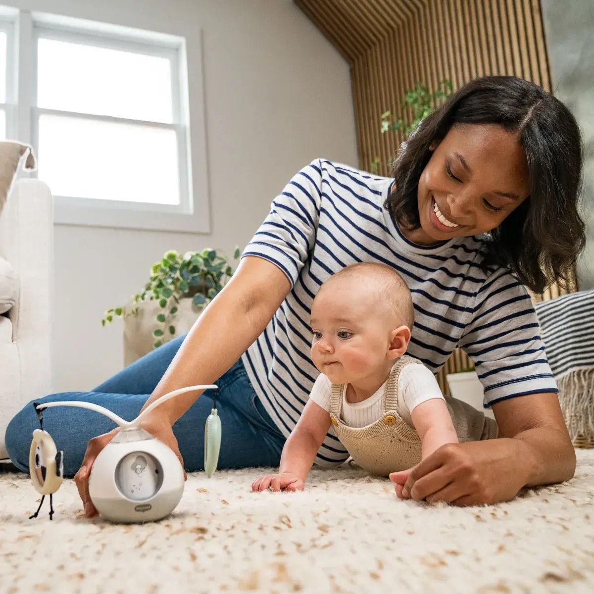 Подвійне призначення — як мобіль для гри на підлозі та як музична іграшка для прогулянок, що кріпиться до візочка чи автокрісла, робить цю іграшку максимально функціональною й універсальною. Музична іграшка з колекції "Нічна галявина" підтримує розвиток моторики, сенсорного сприйняття, емоцій та когнітивних навичок з перших днів життя.