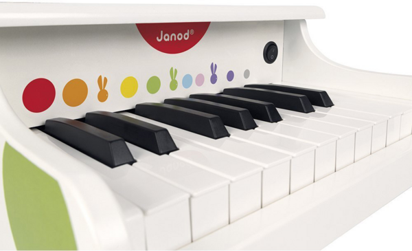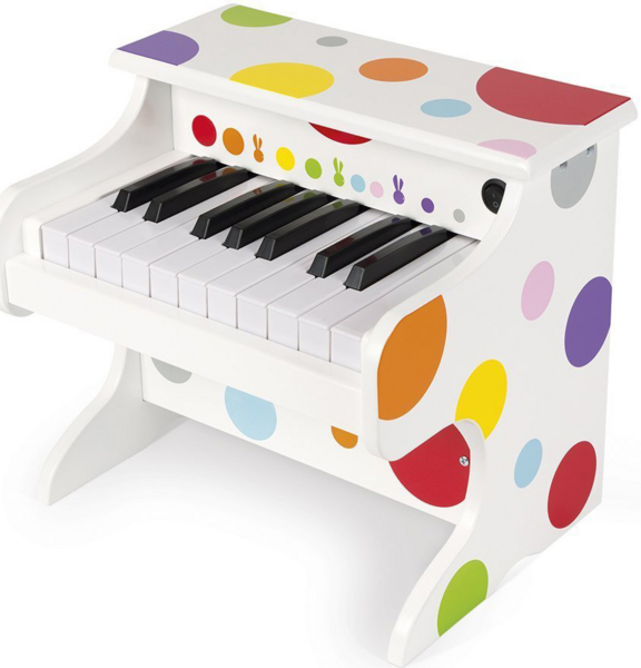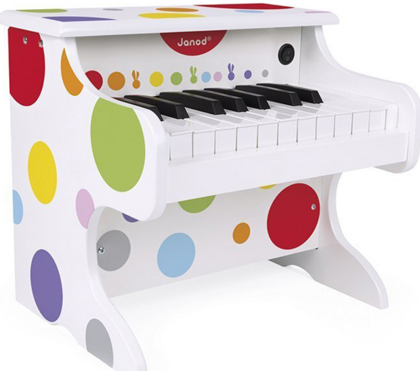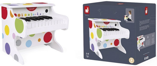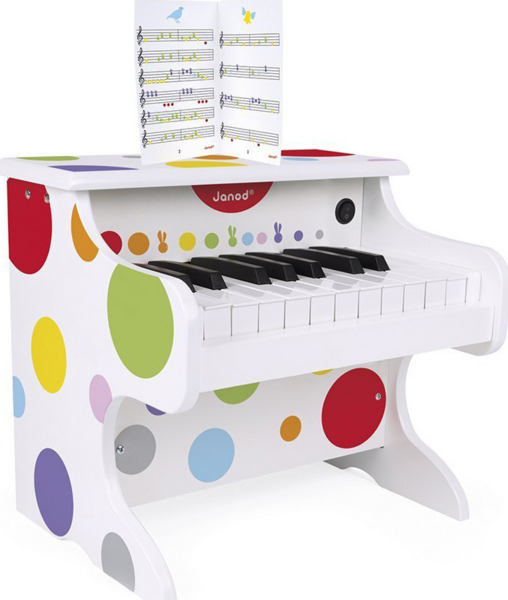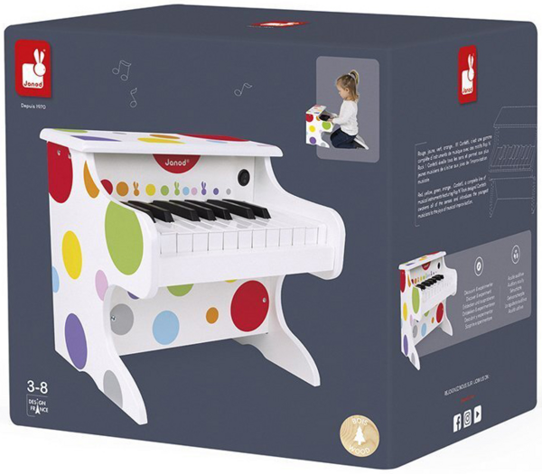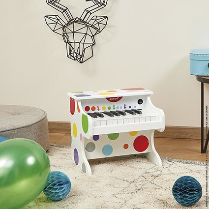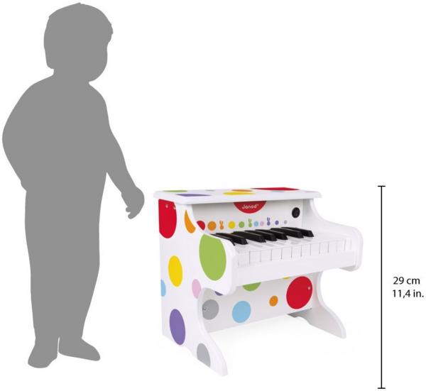 Ця красива копія фортепіано з кольоровим горошком потішить найменших музикантів від 3 років, які хочуть відкрити для себе задоволення від фортепіано та музики. Чотири партитури надані, щоб ваша дитина могла грати на піаніно, як справжній вундеркінд. Ваша дитина також зможе створювати власну музику відповідно до своєї уяви завдяки 18 клавішам, які видають різні звуки. Практично: піаніно автоматично вимикається через 2 хвилини, якщо ваша дитина більше не грає з ним. Щоб використовувати цю іграшку в хороших умовах, вам знадобляться 4 батарейки LR03 1.5 В, які не входять до комплекту.
