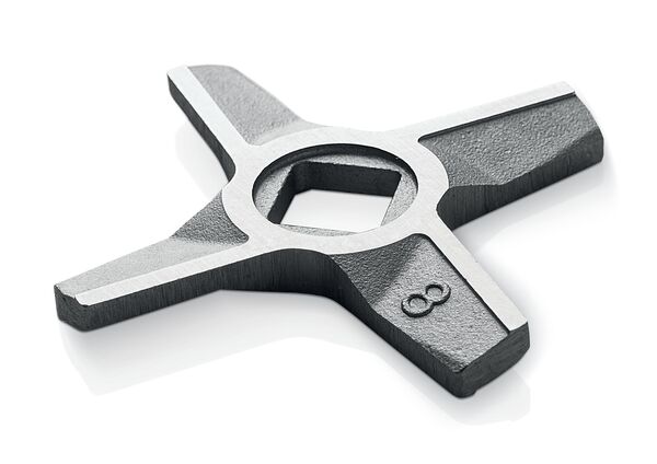 Зазвичай м'ясорубки мають ніж, заточений з одного боку. Але в даній м'ясорубці ніж з нержавіючої сталі має два гострих краю і має низку переваг. По-перше, він може встановлюватися будь-якою стороною до грат, що полегшує процес складання. По-друге, завдяки ріжучим краях з обох сторін такий ніж більш ефективний і має більш тривалий термін екскплуатаціі.