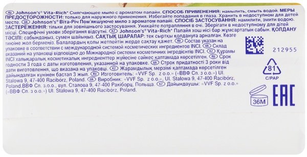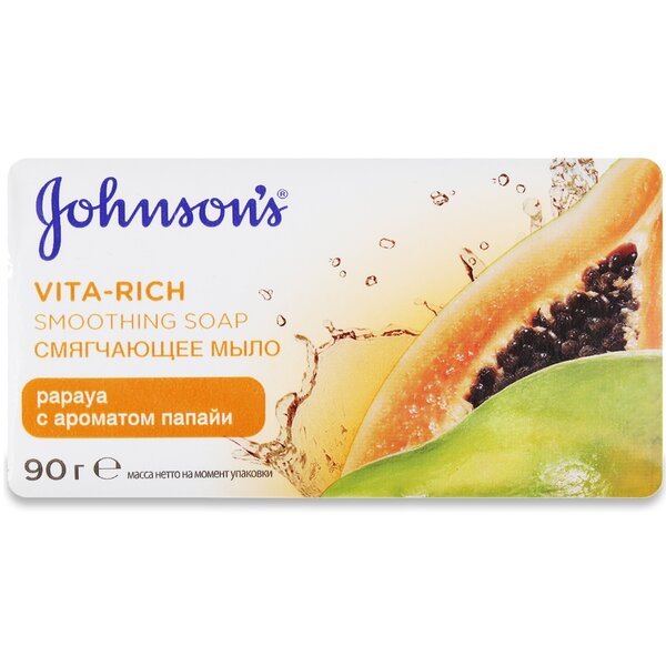 Пом'якшувальне мило Johnson's Body Care Vita Rich з екстрактом папаї та захисною олією активно очищає, пом'якшує та відновлює шкіру, а також надає їй здорового вигляду та відчуття свіжості.