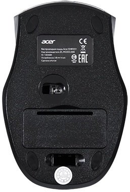 Бездротова миша ACER OMR031 виконана у міцному пластиковому корпусі у класичному чорному кольорі.