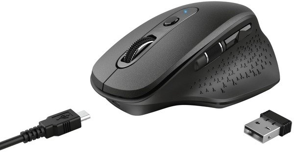 Trust Ozaa розроблено з урахуванням комфорту. Завдяки ергономічному дизайну ви працюватимете весь день, тримаючи руку у зручному положенні. Усього на ньому шість кнопок, дві основні з яких неактивні, тому ви нікому не завадите своєю важкою роботою. Є горизонтальне колесо прокручування, акумулятор та бездротовий зв`язок з радіусом дії до 10 метрів. Це справді миша преміумкласу.