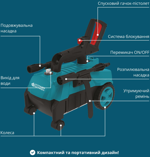 Мийка має компактні розміри, що дозволяє зручно транспортувати її та зберігати. Легкий дизайн та ергономічна форма забезпечують комфортне використання.