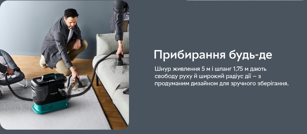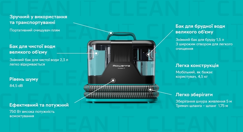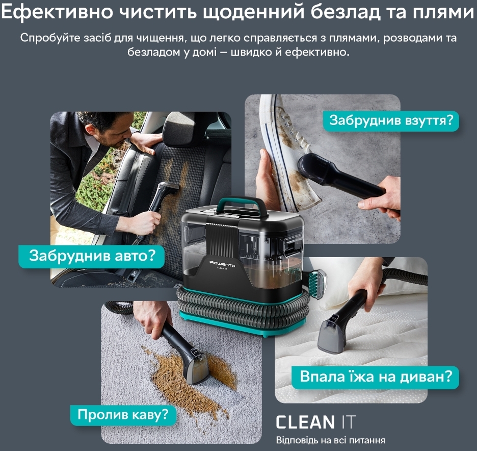 Швидке та ефективне рішення для повсякденного прибирання плям від домашніх улюбленців, розлитої рідини, випадкових забруднень. Rowenta Clean It створено для бездоганної чистоти без зайвих зусиль.