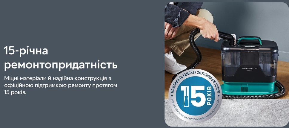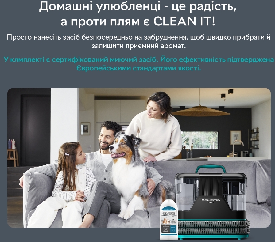 Іро, добрий день! У комплекті є сертифікований миючий засіб Rowenta Pet Stains, створений для роботи зі складними забрудненнями. Його ефективність підтверджена європейськими стандартами якості.