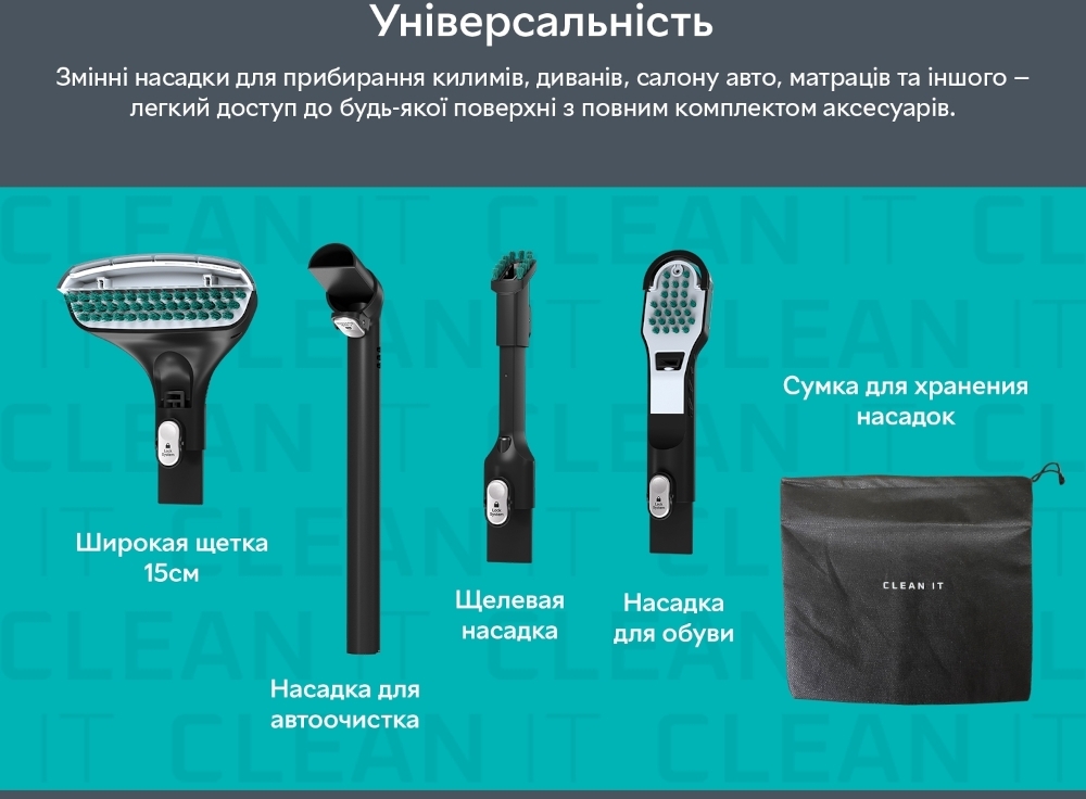 | Комплектація (можливі зміни в різних поставках) | Документація, Миючий засіб, Насадка – 4 шт., Пилосос, Чохол, Щітка для чищення |