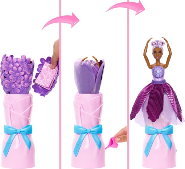 Додайте у гру квіткову магію разом із ляльками Barbie Petal Pop. Кожна лялька Barbie упакована в букет квітів, що робить процес розпакування особливо незабутнім.