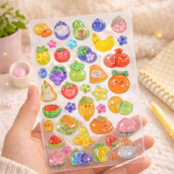 Наліпки мають об’ємний ефект, приємну на дотик текстуру та легкий блиск, який додає кожному фрукту особливого шарму. Прикрашайте зошити, листівки, блокноти чи подарунки та створюйте власний барвистий світ радості.