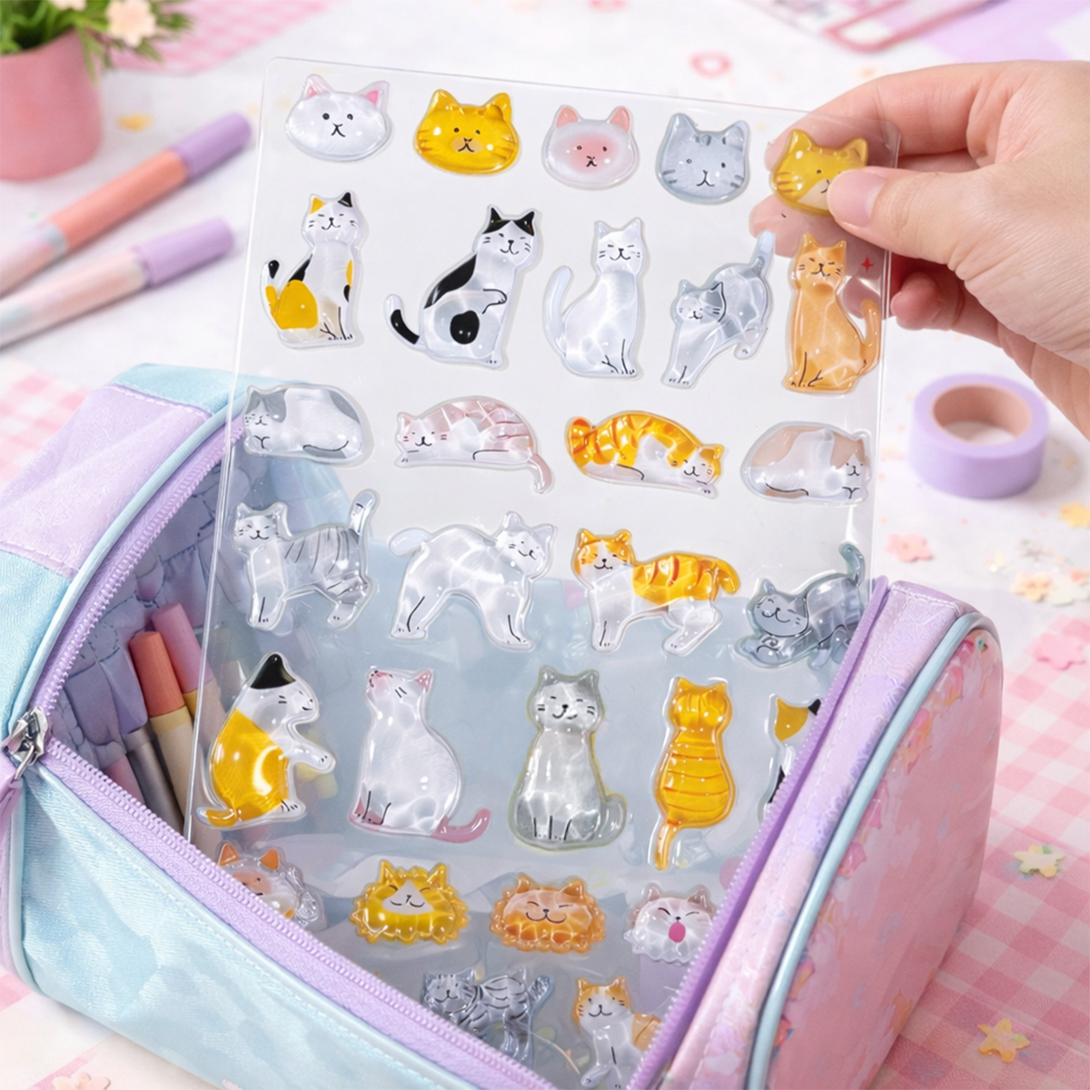 Наліпки мають об’ємний ефект, приємну на дотик текстуру та м’які кольори, що роблять кожного котика ще симпатичнішим. Прикрашайте ними зошити, блокноти, подарунки чи аксесуари - і створюйте власний світ ніжності.