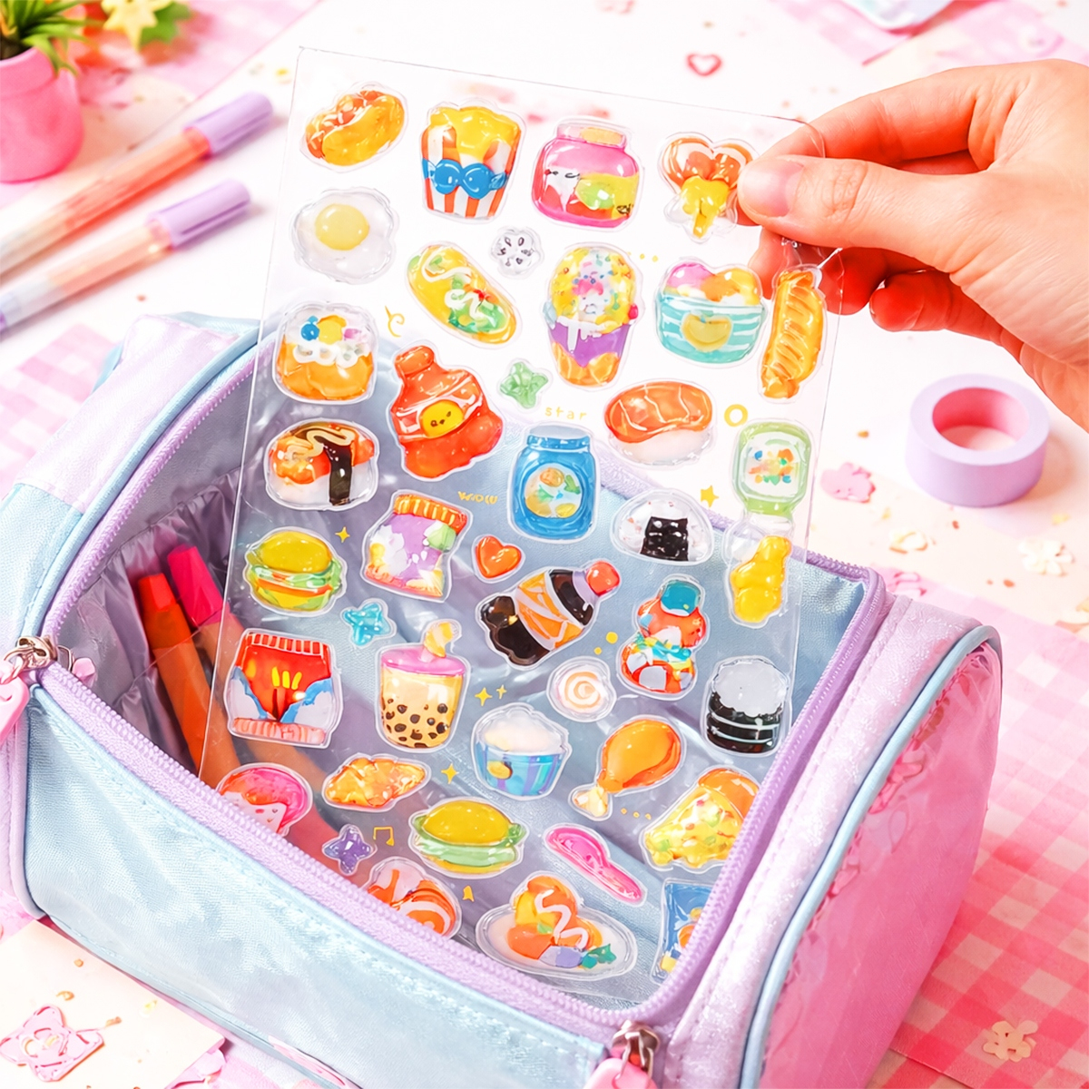 Наліпки мають об’ємний ефект, приємну на дотик текстуру та легкий блиск, який додає кожному елементу особливого шарму. Вони чудово підійдуть для оформлення зошитів, блокнотів, подарунків або просто для декору улюблених речей.