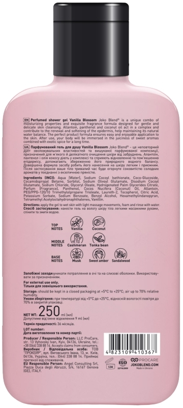 Парфумований гель для душу Joko Blend Vanilla Blossom — неповторний дует зволожувальних властивостей та вишуканої парфумованої композиції, призначений для м’якого й делікатного очищення шкіри від забруднень. Збагачений активними компонентами, такими як алантоїн, пантенол і олія кокоса, гель сприяє відновленню та пом'якшенню епідермісу, усуває сухість і лущення. Довершена формула засобу робить його нанесення на шкіру легким і приємним. Після застосування тіло тривалий час буде огорнуте соковитістю солодких ароматів у поєднанні з екзотичною пряністю.
