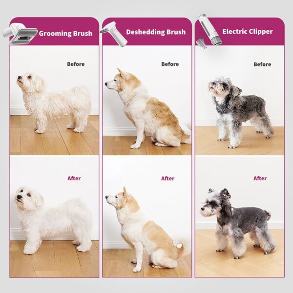 Цей набір для грумінгу поєднує п'ять основних інструментів в одному пристрої, що робить догляд за домашніми улюбленцями простішим та ефективнішим. До набору входить щітка-греймер для розплутування та видалення шерсті, інструмент для вичісування для зменшення линяння, електричний тример для точного підстригання, функція пилососа для прибирання шерсті, що випала, та фен для сушіння після купання. Завдяки цим п'яти функціям власники домашніх тварин можуть легко підтримувати шерсть свого улюбленця в належному стані, зменшуючи її линяння, запобігаючи утворенню ковтунів і забезпечуючи чистоту та комфорт свого улюбленця.