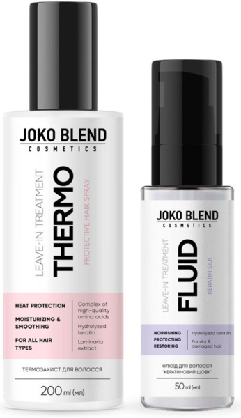 Набір для догляду за волоссям Keratin Therapy Joko Blend включає два незмивні засоби з кератином для забезпечення комплексного рішення: спрей-термозахист від негативного впливу високих температур та флюїд "Кератиновий Шовк" для відновлення структури пошкодженого волосся. Дворівневий догляд надає миттєвий ефект, зміцнюючи локони та повертаючи їм природний блиск і шовковистість. З кожним застосуванням засобів підвищується еластичність волосся, полегшується його розчісування й укладання. Сет упакований в мінімалістичний бавовняний мішечок.