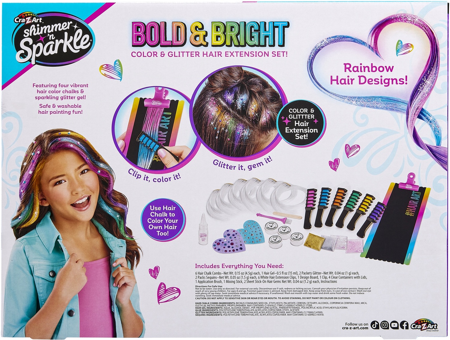 Перетворіть зачіску на яскраве шоу кольору та блиску разом із творчим набором для стилізації волосся Cra-Z-Art Colour FX. За допомогою накладних пасм, гребінців з крейдою та блискучого гелю дитина зможе створювати ефектні "салонні" зачіски власноруч. Просто закріпіть пасмо на дизайнерській дошці, проведіть кольоровим гребінцем - і отримайте насичений відтінок. Додайте глітер-гель, паєтки та камінці - і образ засяє по-справжньому святково. Кольори легко змиваються, а пасма можна використовувати знову для нових модних ідей.