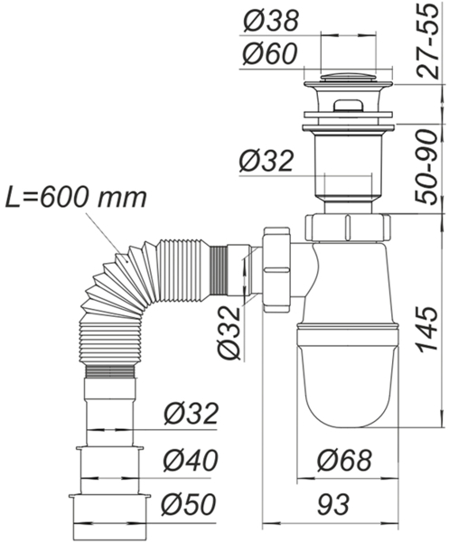 Сифон включає мокрий гідрозатвор та автоматичний механізм Click-Clack.