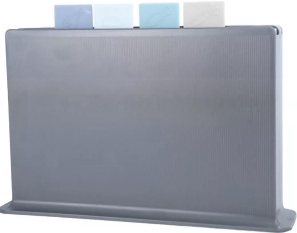 Завдяки непересічному дизайну та елегантним кольорам вироби будуть ефектним акцентом на кухні. Компактна підставка темно-сірого кольору забезпечує зручне зберігання дошок, надаючи змогу підтримувати лад на робочій поверхні. Вироби гармонійно поєднуються між собою, створюючи, особливу атмосферу.