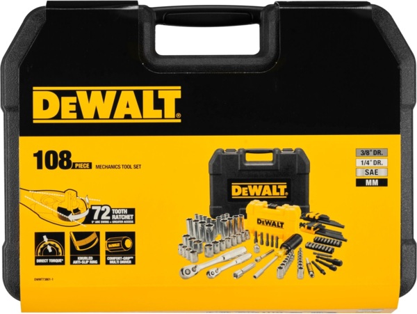 DeWalt DWMT73801-1 — розширений набір із 108 предметів для майстерні, автосервісу та гаража, який об'єднує торцеві головки, біти і шестигранні ключі під два посадкові квадрати — 1/4" і 3/8". Такий підхід дозволяє використовувати один набір для принципово різних задач: квадрат 1/4" оптимальний для дрібного кріплення, роботи в обмеженому доступі та точного затягування, а 3/8" — для болтів і гайок із підвищеним моментом затягування, де 1/4" вже не вистачає за міцністю з'єднання. Великий асортимент розмірів і профілів у складі набору знижує ймовірність ситуації «немає потрібного розміру» при роботі зі стандартним метричним і дюймовим кріпленням. Усі предмети розміщені у фіксованих гніздах кейса — кожен елемент на своєму місці, комплект залишається повним і готовим до роботи. Кейс зручний для зберігання в майстерні та перевезення на об'єкт або в автомобілі.