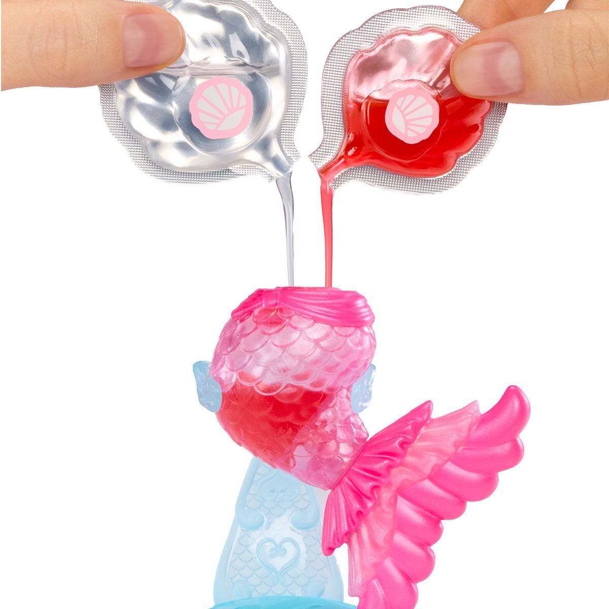 Змішайте основу та барвник у стильній пляшечці для блиску у формі хвостика русалоньки. Після змішування аплікатор-плавник слугує зручним інструментом для нанесення блиску та доповнює образ русалоньки.