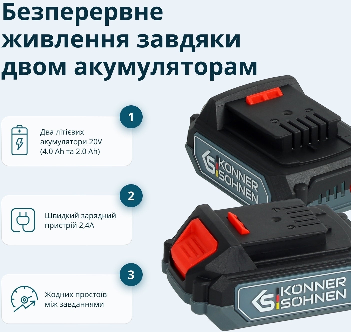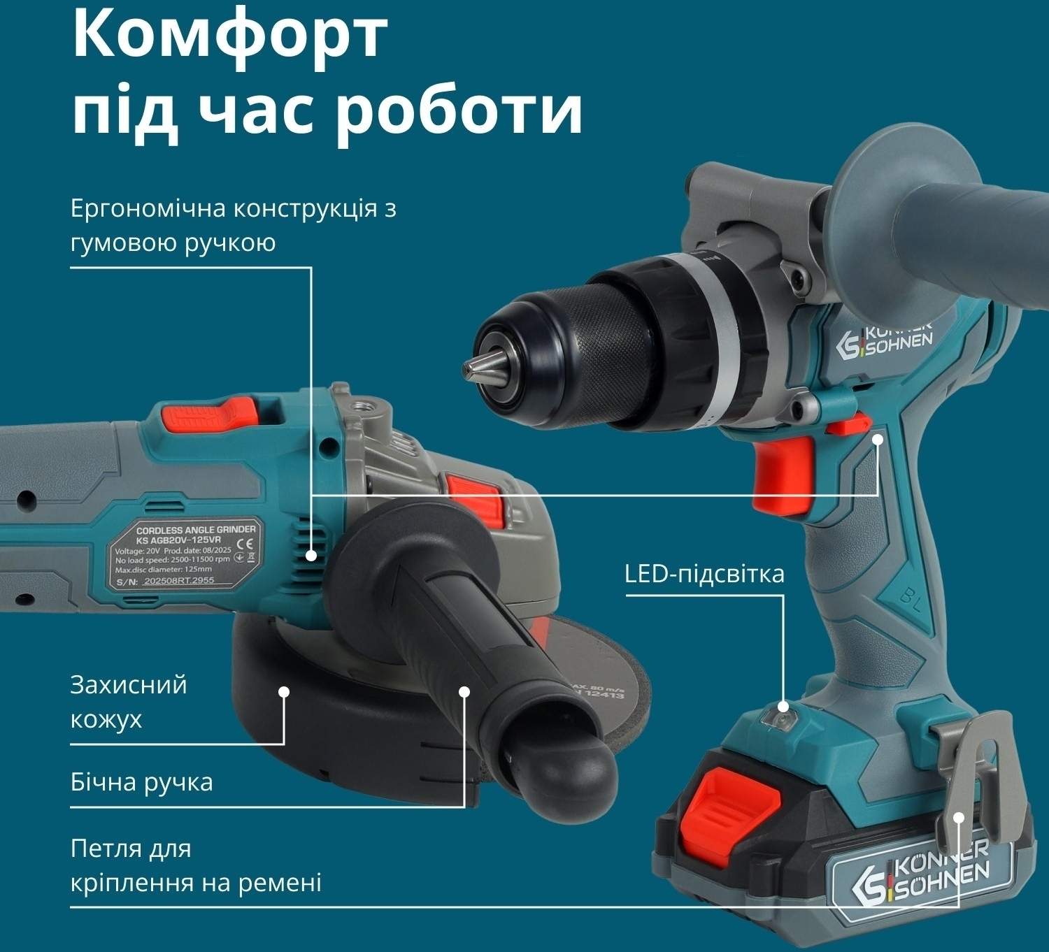 - Набір акумуляторних інструментів Konner&Sohnen KS IDAGB 20V (KSIDAGB20VSET1)