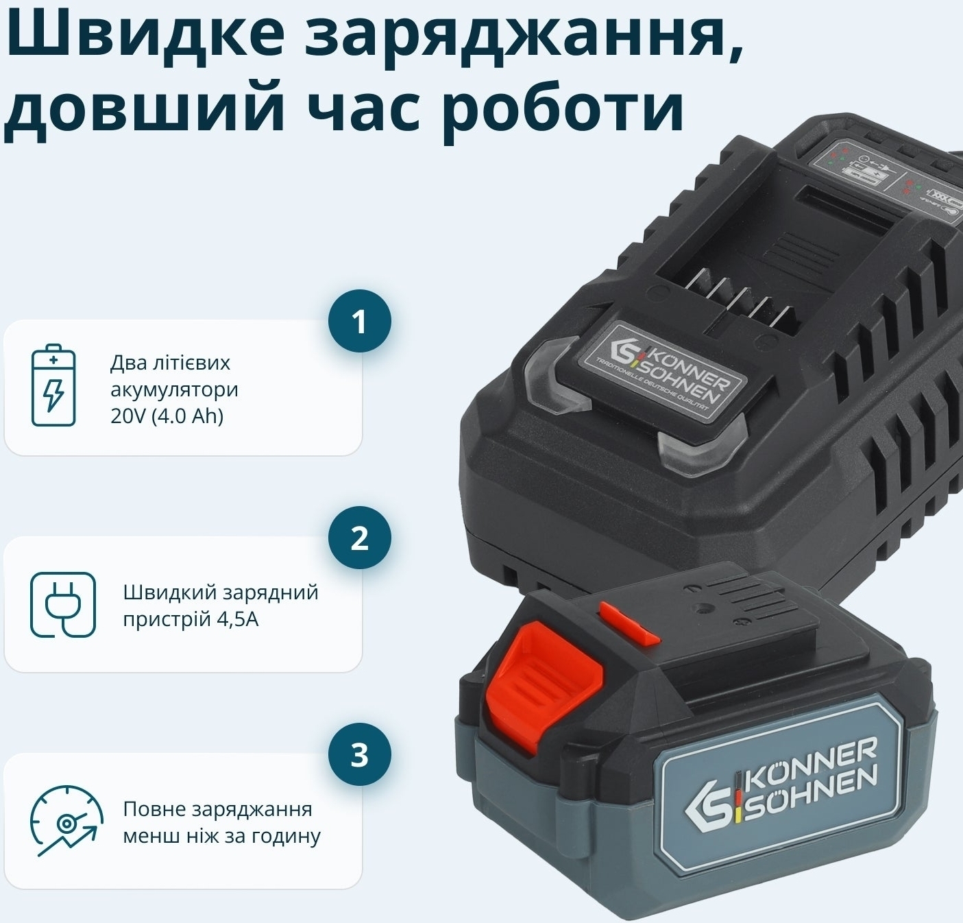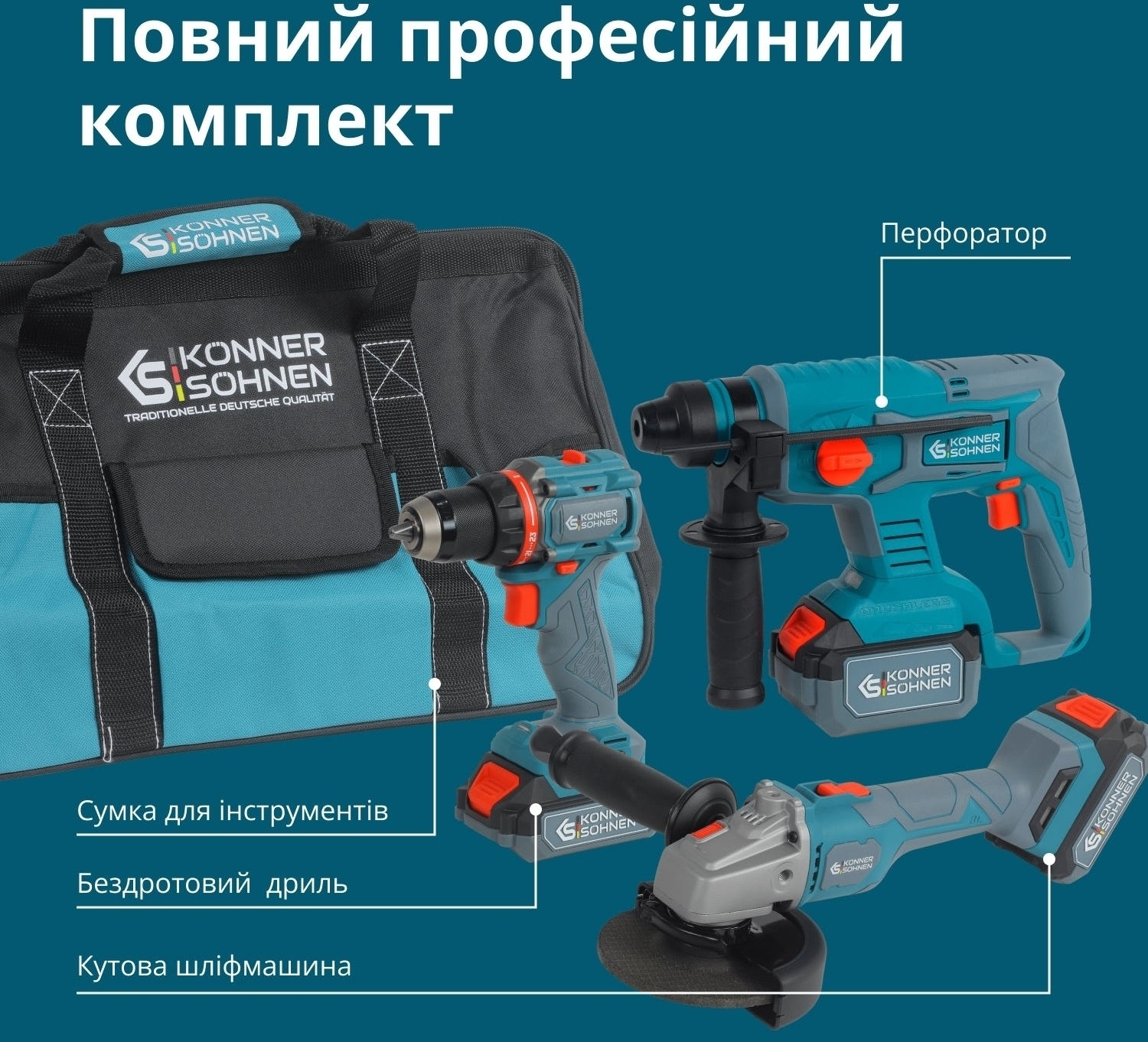 - Набір акумуляторних інструментів Konner&Sohnen KS RHAGD 20V (KSRHAGD20VSET3)