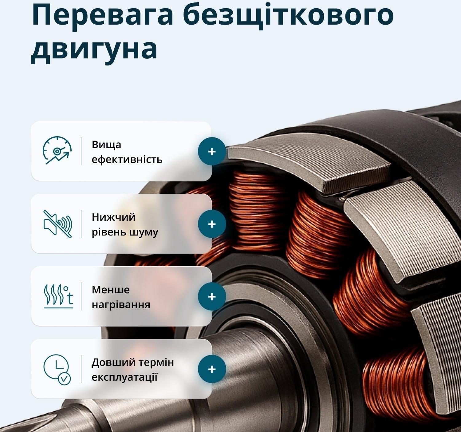 Забезпечують більшу потужність при меншому споживанні енергії, працюють тихіше та не потребують складного обслуговування. Це дозволяє інструментам довше залишатися ефективними, виконувати більше завдань на одному заряді та служити надійно протягом тривалого часу.