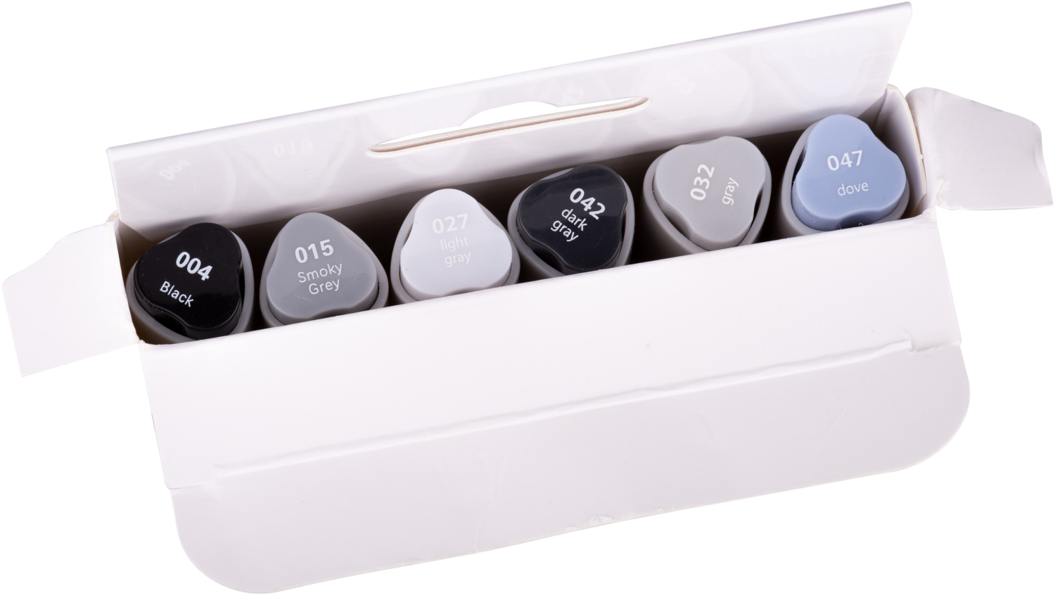 Набір включає такі кольори: 047 сизий, 032 сірий, 042 темно-сірий, 027 світло-сірий, 015 димчасто-сірий та 004 чорний.