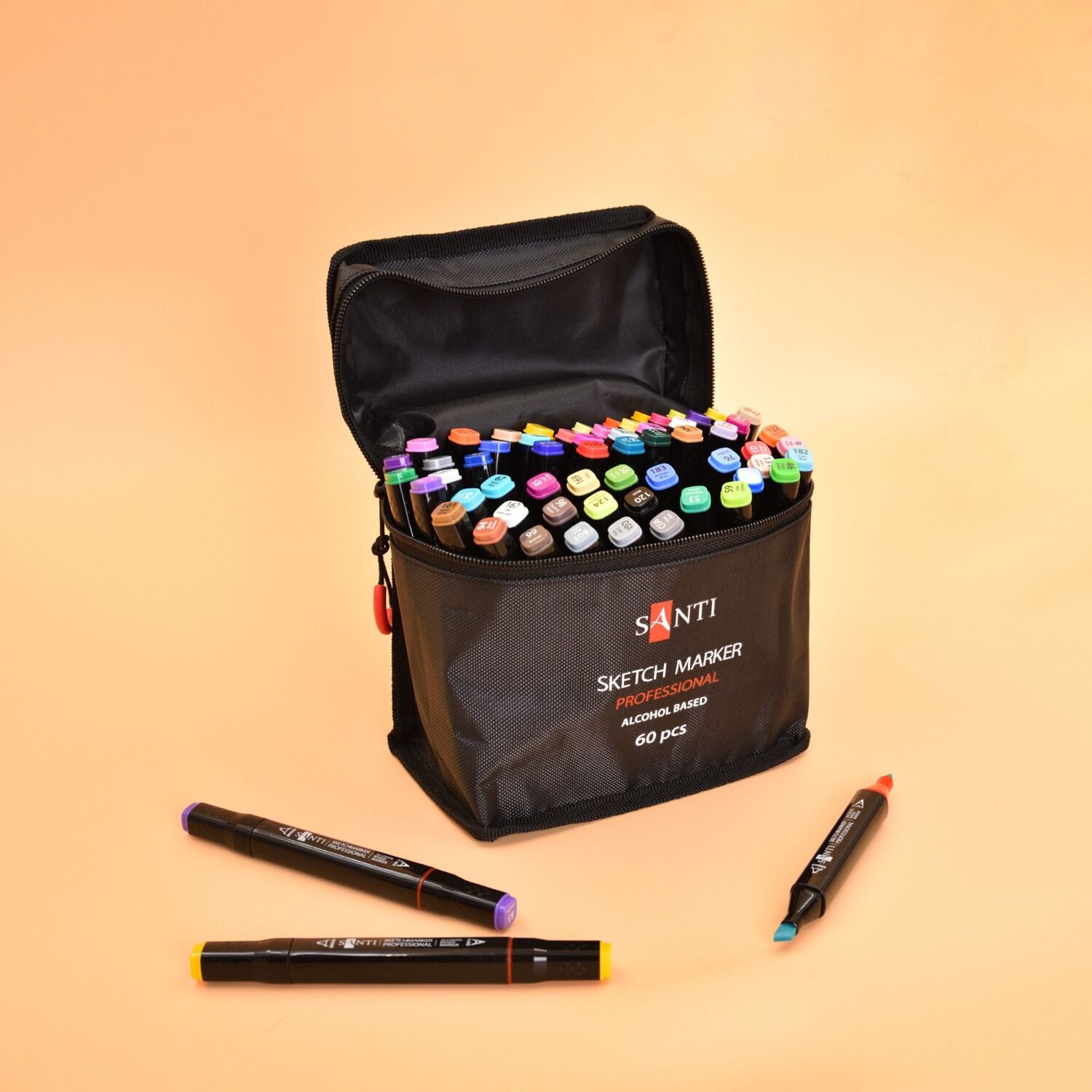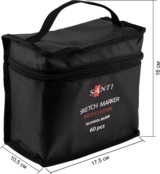 Набір упакований у сумку, яка забезпечує акуратне зберігання та зручне транспортування маркерів. Сумка виготовлена з міцного матеріалу, оснащена блискавкою-застібкою, яка надійно фіксує вміст усередині. Зручна ручка у верхній частині дозволяє легко переносити набір – у руках, у рюкзаку або у валізі. Кожен маркер розташований вертикально, що дозволяє швидко знайти потрібний колір.