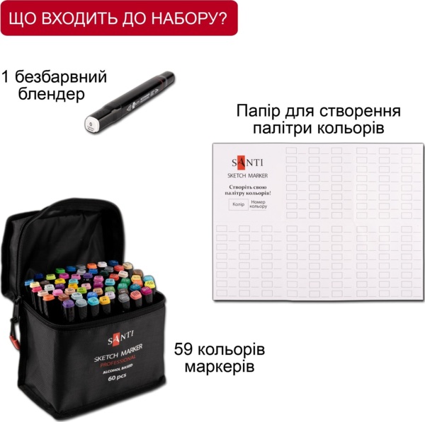| Комплектація (можливі зміни в різних поставках) | Безбарвний блендер, Аркуш для створення палітри, Маркер – 59 шт., Сумка |