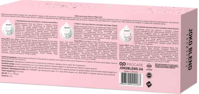 - Ліфтинг-маска для обличчя з мідним пептидом Copper Peptide Joko Blend: ніацинамід, гіалуронат натрію (Ultra Filling Spheres), трипептид міді, оксид цинку.