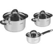 Набір посуду Gemini Salerno - це втілення сучасного стилю та функціональності на кухні. У комплекті є ківш 1,2 л, а також каструлі об'ємом 2,3 л і 3,4 л зі скляними кришками, що мають отвори для пари. Нержавіюча сталь у поєднанні з товстим дном (2,9 мм) забезпечує рівномірне нагрівання. Для додаткової зручності на кожному предметі передбачена мірна шкала.