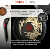 Покриття Titanium 3X служить у 3 рази довше, ніж стандартне антипригарне покриття Tefal. Забезпечує тривалий термін служби, легке очищення та повну безпеку: без ПФОА, свинцю й кадмію.