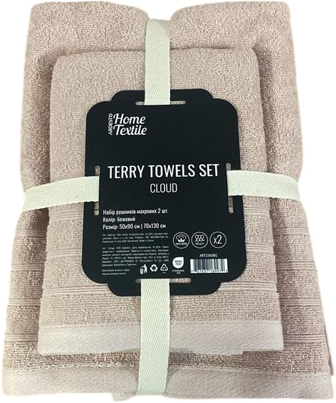 - Набір рушників махрових ARDESTO Cloud 50х90см, 70х130см, 2шт, 100% бавовна, бежевий (ART2360BG)