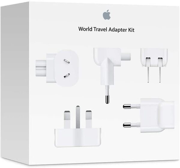Набір World Travel Adapter Kit включає адаптер USB Power Adapter, кабель USB 30-pin to USB, і набір з 6 вилок мережі змінного струму, які підходять до розеток у різних країнах. Це зручний набір для мандрівника. Цей набір працює з iPod, iPhone, iPad, адаптерами Apple MagSafe Power Adapters (для MacBook та MacBook Pro), Portable Power Adapters (для iBook та PowerBook) та AirPort Express. Вилки з набору підходять до розеток Північної Америки, Японії, Китаю, Великобританії, Європи, Кореї, Австралії та Гонг-Конгу. Примітка: для використання цього набору з пристроями з роз'ємом Lightning — такими, як iPhone 5, iPad mini та iPad з дисплеєм Retina — вам знадобиться кабель Lightning на USB Cable (придбається окремо).