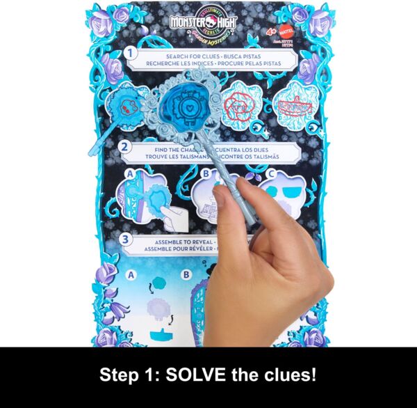Ціла пригода, повна загадок і сюрпризів, чекає на дівчинку з цим набором "Жахо-секрети" та лялькою Твайли з Monster High! Твайла ховається десь у шафі, що формою нагадує ворота школи Monster High. Та де ж сама лялька? Шукайте підказки в інструкції, щоб дізнатися де вона знаходиться, та в процесі знайдіть понад 19 інших фантастичних сюрпризів. Дійте в три етапи: розгадуйте, розблоковуйте, відкривайте. Це буде справжній крутий квест з чималою кількістю подарунків в кінці! Спочатку за допомогою ключа-лупи розгадайте, що за символи зображені в інструкції на карті скарбів. Далі відчиніть дверцята шафи, використовуючи той самий ключ, щоб знайти жетони, які відповідають символам на карті. Вони приховані десь серед одягу та тематичних аксесуарів в загадкових пакетиках. Дотримуючись інструкції, складіть три жетони разом - і ви отримаєте єдиний талісман. Вставте його в отвір шафи, в тій частині, де немає дверцят, з самого низу, а потім тягніть талісман уверх вздовж отвору, як блискавку. А ось і вона - жах яка крута Твайла, у всій своїй монстрашенній красі, підіймається, ніби ліфтом, вгору! Підіймайте та опускайте її знову і знову для безперервної забави. Тепер, коли Твайлу, її вбрання й аксесуари в стилі попзірки, знайдено, час влаштувати розваги з перевдяганням. Більше ніж 125 комбінацій одягу та аксесуарів дозволять створювати безліч різних образів. Після завершення гри діти віком від 4 років можуть скласти ляльку, одяг та аксесуари, що входять до комплекту, у таємничу шафу, яка ідеально підходить як для гри, так і для зберігання дрібничок! Лялька не може стояти самостійно. Кольори, аксесуари та зовнішній вигляд можуть відрізнятися від зображених.