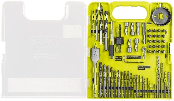 Склад набору: 20x25мм біти (4xPH2, PZ1, 4xPZ2, PZ3, 2xTX15, 2xTX20, 2xTX25, 2xTX30), 1xтримач біт, 2x50мм біти (PZ2, TX25), 19xHSS свердла по металу (2x1.5, 2, 2x2.5, 3, 3x3.2, 3.5, 2x4, 4.2, 2x4.5, 5, 5.5, 6, 6.5мм), 1x пухові свердло (25мм), 4x свердла по дереву (4, 6, 8, 9 мм) , 4x свердла по каменю (4, 4.5, 6, 8 мм), 5x немагнітні торцеві насадки (6, 7, 8, 9, 10 мм), 1x пиляльна коронка (54мм), 1x пробійник, 1x Hex ключ, 1x 90 'Зенкер, 1x центрирующее свердло.