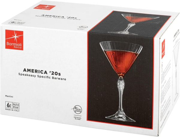 Цей набір є частиною елегантної колекції, натхненної 1920-ми роками, яка переносить гламур модних американських джазових барів крізь історію: де розмови велися про мистецтво, а атмосфера була сповнена безпрецедентної новизни та ентузіазму. Кожен келих має дуже коштовний та вінтажний дизайн. Ніжка прикрашена елегантно обробленою краплеподібною прикрасою, а чаша, що має форму перевернутого трикутника, густо гранована. Келих ідеально підходить для подачі коктейлів Мартіні.